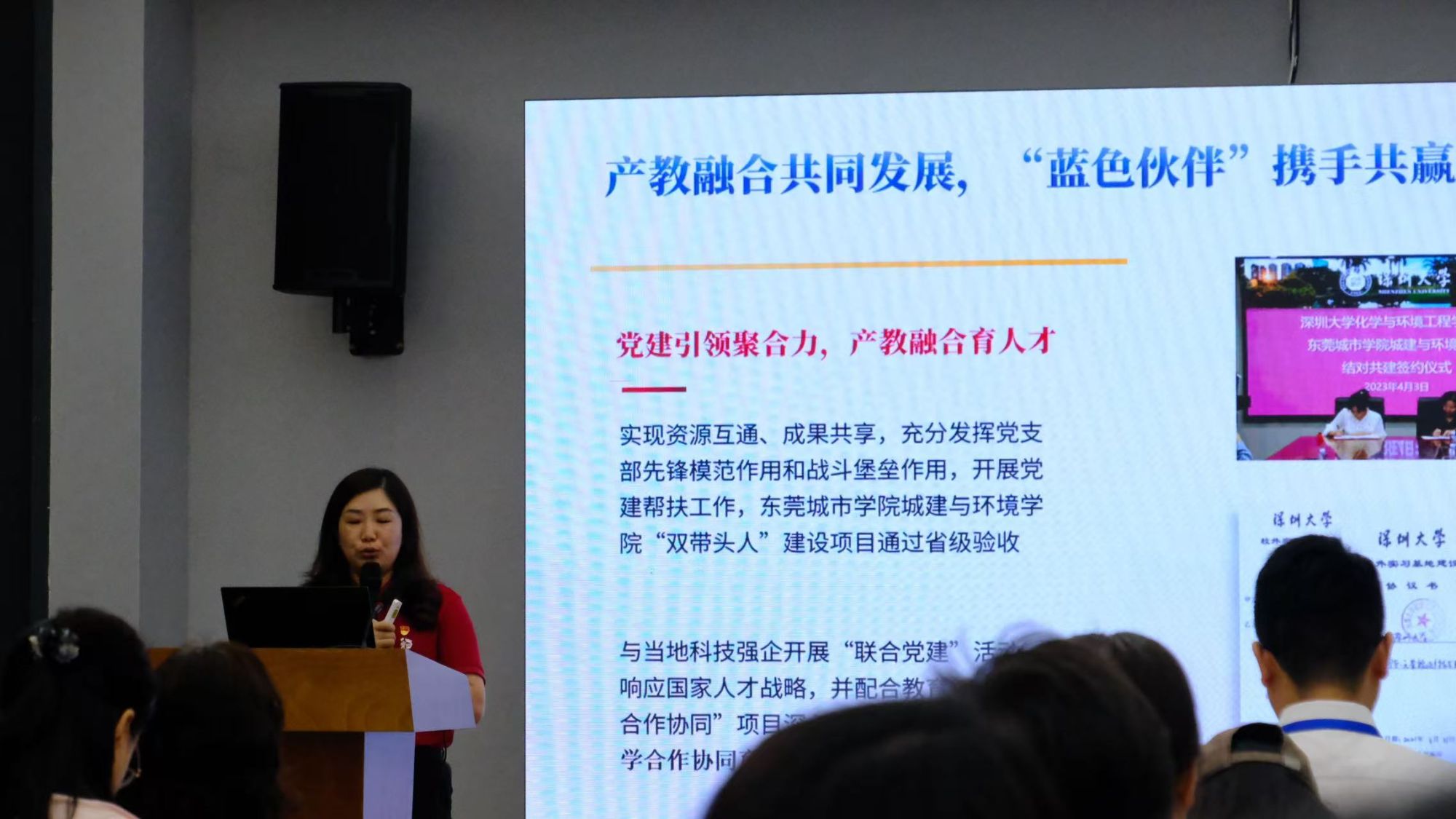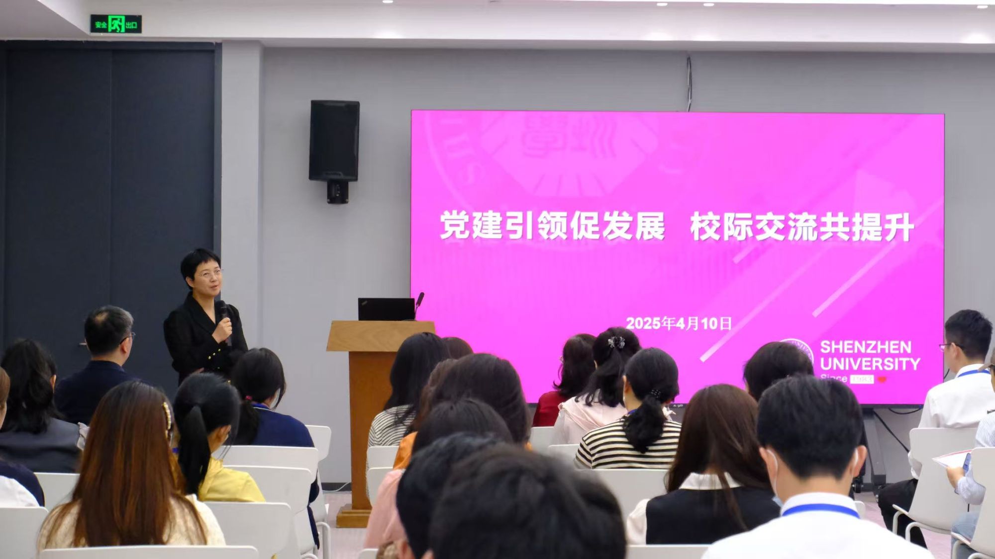 在守正楼A213报告厅举行了党建交流会,深圳大学化学与环境工程学院党委副书记徐晓玲主持会议。党委书记李翠华致欢迎辞,回顾了深圳大学扎根特区、服务国家的办学历程,介绍了深圳大学以改革创新为基因,在人才培养、科研创新、服务地方发展等方面取得了一系列令人瞩目的成就,成为高等教育领域的“深圳速度”典范。